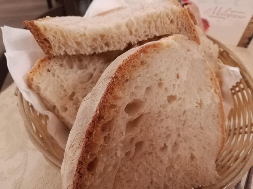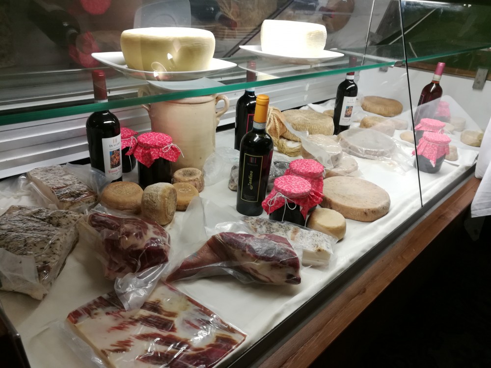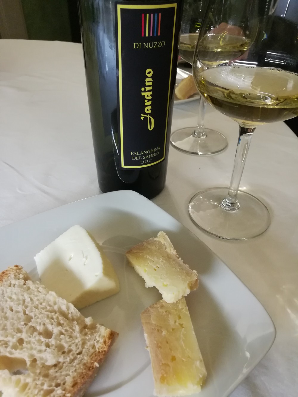 Veniamo accolti nella sala degustazione dove fanno bella mostra i formaggi e i vini. Assaggiamo un formaggio vaccino stagionato 12/14 mesi ed un primo sale prodotti a Sant’Agata de’ Goti, accompagnati dal pane cotto a legna fatto in casa con farine dell’alto Fortore e lievito madre e da un’ottima Falanghina Doc “Jardino” prodotta nella propria azienda vitivinicola.