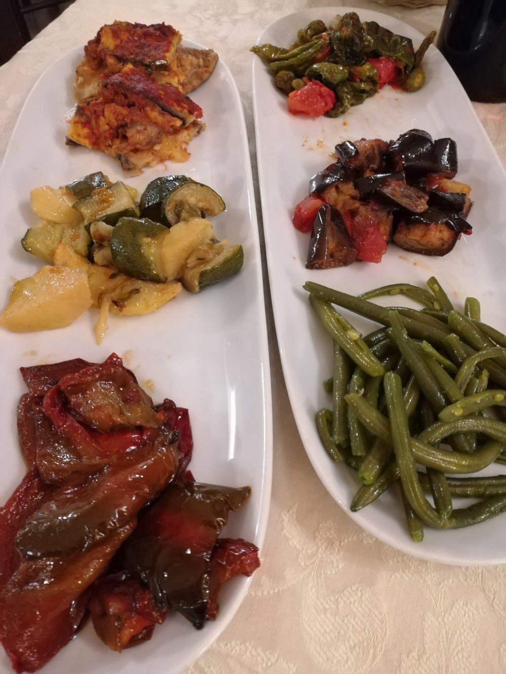 Ci accomodiamo dunque nella sala interna e cominciamo ad ordinare l’immancabile antipasto: il tagliere è composto da un eccellente prosciutto crudo di Pietraroja; da straordinarie salsiccia secca e sopressata di produzione propria e un avvolgente caciocavallo di Castel Franco in Miscano. L’altissima qualità di tali prodotti si traduce in un idillio per le papille gustative e per l’olfatto. Vicino al tagliere vengono portati due vassoi con le verdure del proprio orto (parmigiana di melanzane, zucchine e patate, fagiolini, melanzane a funghetto, peperoni, peperoncini do’ ciummo) la cui bontà è esaltata ancor di più dall’utilizzo dell’olio extra vergine di oliva prodotto dagli ulivi dell’azienda stessa. Importante poi sottolineare che le cantine in pietra di tufo risultano essere un’ambientazione ideale anche per la conservazione e l’affinamento dei salumi e formaggi proposti.