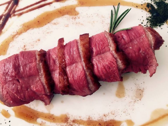 Don Alfonso, petto d’anatra ai sentori di cannella con polvere di borragine, composta di mele e riduzione di aceto balsamico