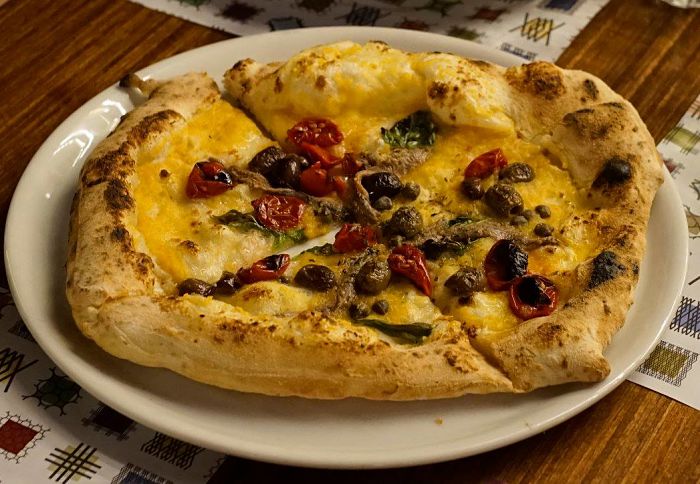 Corrado c’ha poi proposto una fuga al sud con la pizza Meenchia ovviamente ispirata ai sapori della Sicilia: pomodoro giallo, capperi di salina, oliva del Belice, alici di cerata, pomodori ciliegina, dry origano.