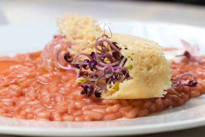 Risotto ai gamberi rossi di Gallipoli, gocce di burrata e dressing di fiaschetto marinato – foto di Luciano Furia