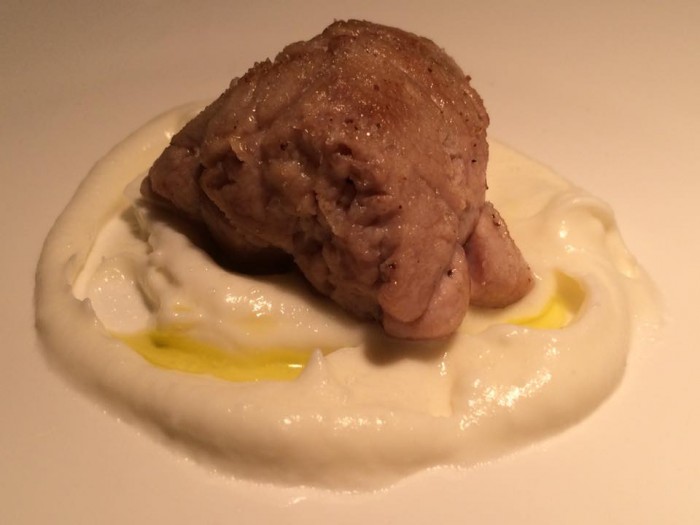 In fondo il nocciolo della ricerca del grande cuoco abruzzese è questo: niente salse, niente grassi, niente zuccheri, tanto vegetale. Acidità e toni amari adesso tanto di moda supportano la materia ma non la semplificano.