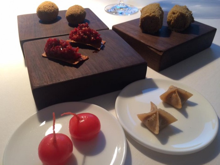Reale di Niko Romito, aperitivo con spugna di pistacchio, ravanelli sotto aceto, ravioli di ragu’, polpettine e crudo