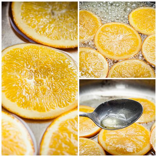 Sciogliete lo zucchero in 500 g di acqua e sistemate le fette d’arancia sul fondo del tegame coprendole con lo sciroppo, portate a ebollizione e lasciatele sobbollire pianissimo per una quarantina di minuti.