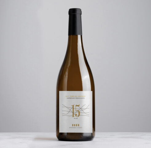 L’asprinio, uva biotipo locale, in altri pochi ( rari ) areali della Campania mette radici, ed ha un grappolo conico allungato e la caratteristica del sapore acidulo che si percepisce come freschezza nel vino che se ne ricava, mentre la bellezza delle alberate è ancora di più esaltata dalla vendemmia effettuatata per mano di uomini che si arrampicano su scale a pioli lunghe e strette, chiamate scalillo. Il vino 15 Metri, con una tiratura di 2500 bottiglie, è ottenuto con il metodo charmat, presentandosi nel bicchiere con un perlage persistente e con profumi freschi di futta croccante, come la mela e la pesca bianca. Il sorso è teso e sostenuto dall’acidità, chiudendo con un leggero ritorno di menta e di mandorla fresca.
