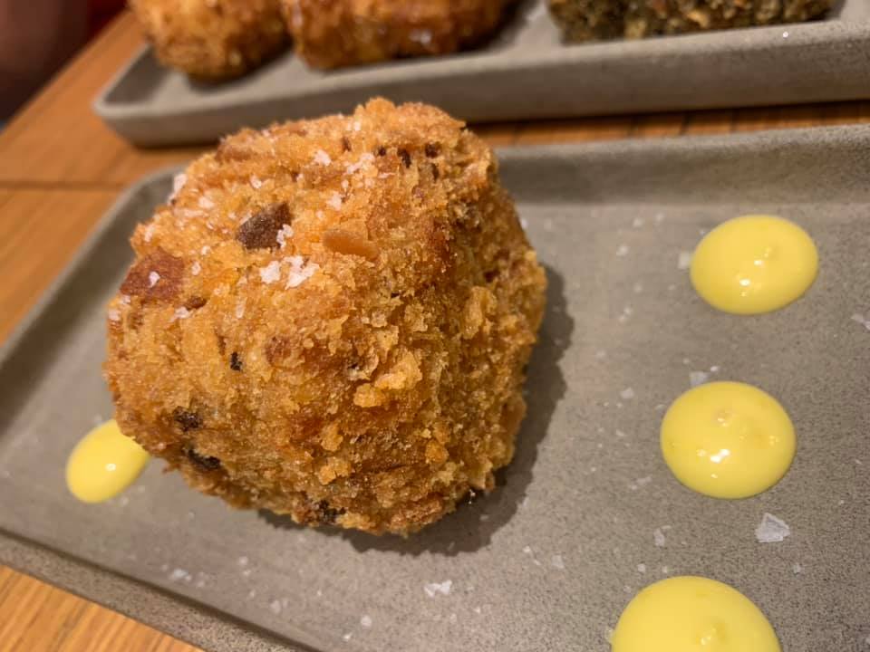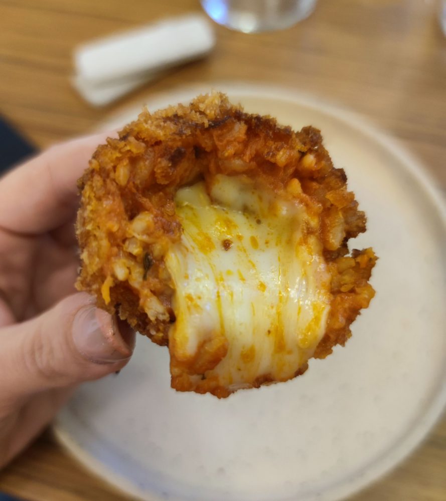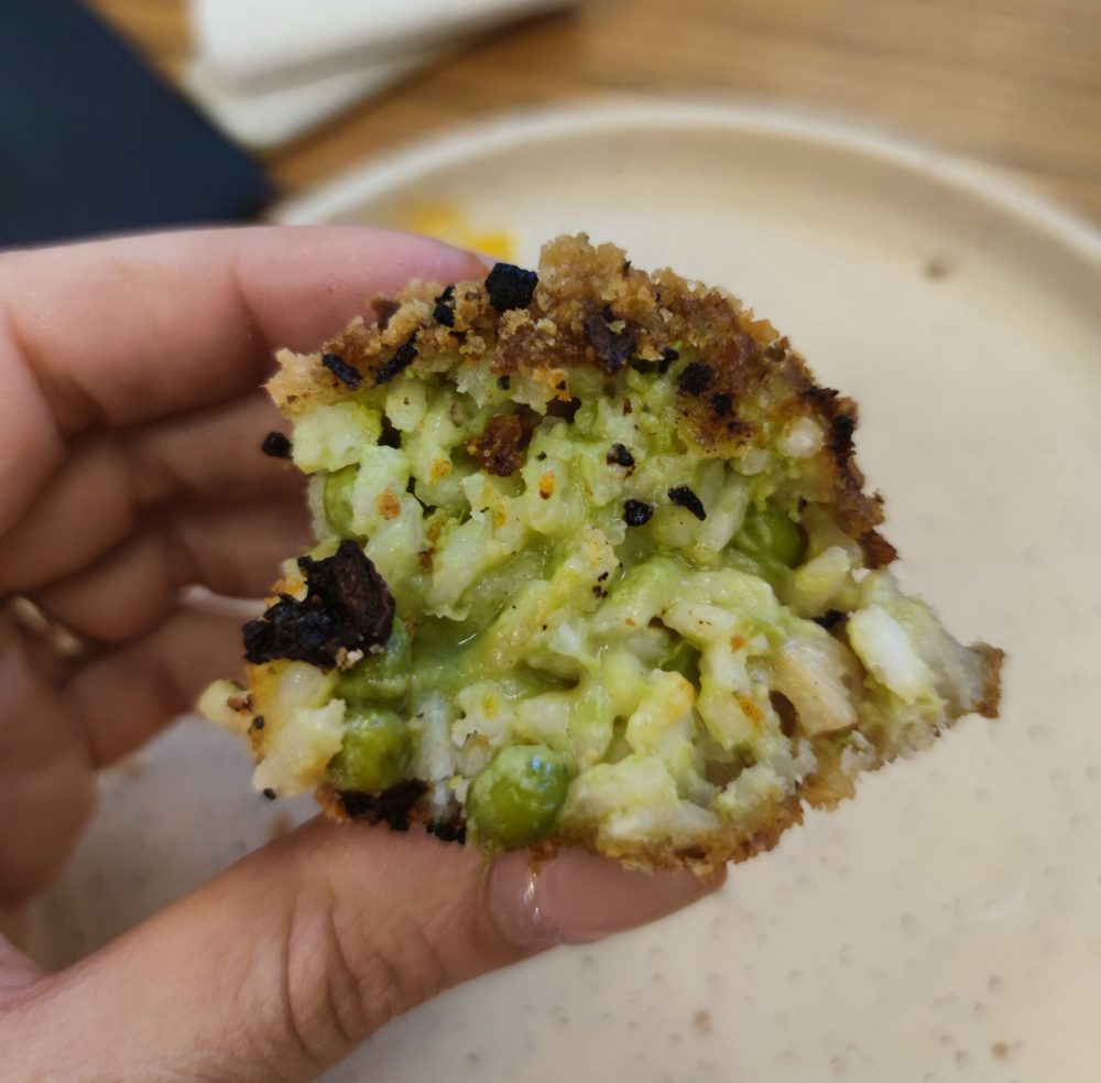 Molto buono anche il supplì guanciale, piselli e pecorino, panato con cipolla bruciata (4€): una sorta di gricia di piselli.