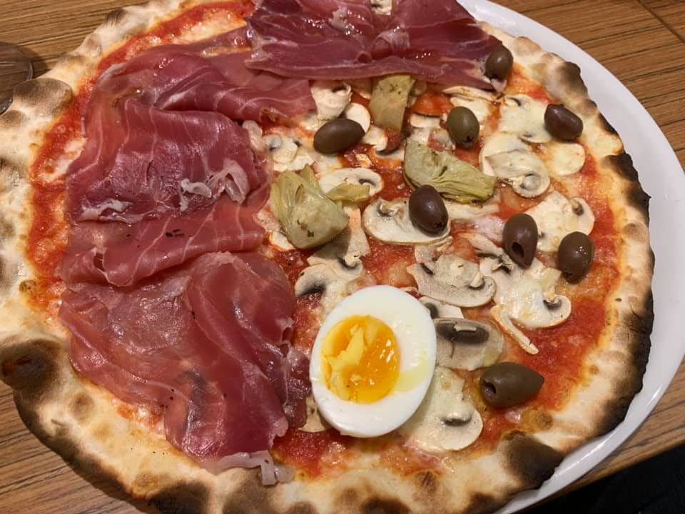 Forse troppo prosciutto crudo nella capricciosa, sviziosa nei suoi elementi con l’immancabile uovo tipico a Roma