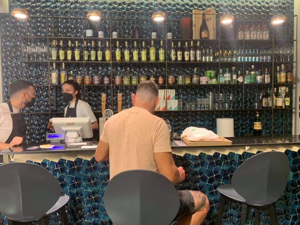 Il bancone del bar si trova all’entrata: si può mangiare la pizza anche lì, intraprendendo, magari, un percorso in abbinamento con i distillati, gli 8 gin artigianali e 7 diverse toniche, whisky, mezcal e tequila, con il supporto di Claudia, che è anche Sommelier. Accanto al bancone, in un angolo appartato, è stato posizionato un tavolo ovale, che Jacopo sta pensando, in futuro, di utilizzare per un menu degustazione.