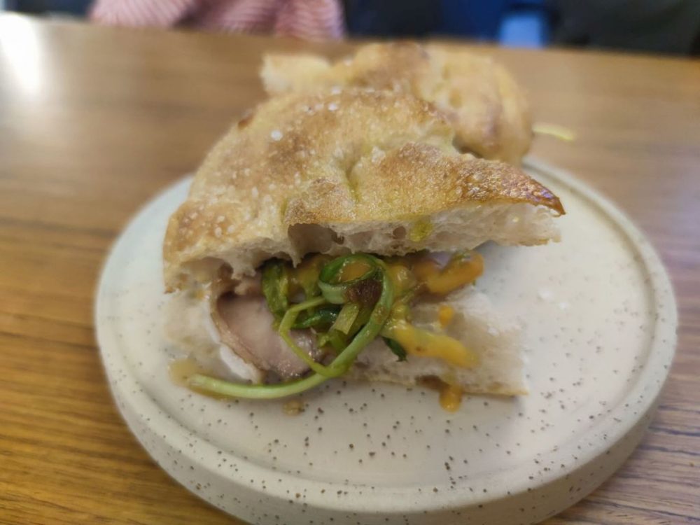 La seconda si chiama “Pancia Piena” (5€): un trancio di pizza al padellino con pre-fermento di lievito madre, farcito con pancia di maiale Kakuni, puntarelle e albicocche senapate. In questo caso, Jacopo ha utilizzato una ricetta giapponese che prevede una cottura brasata della pancia.