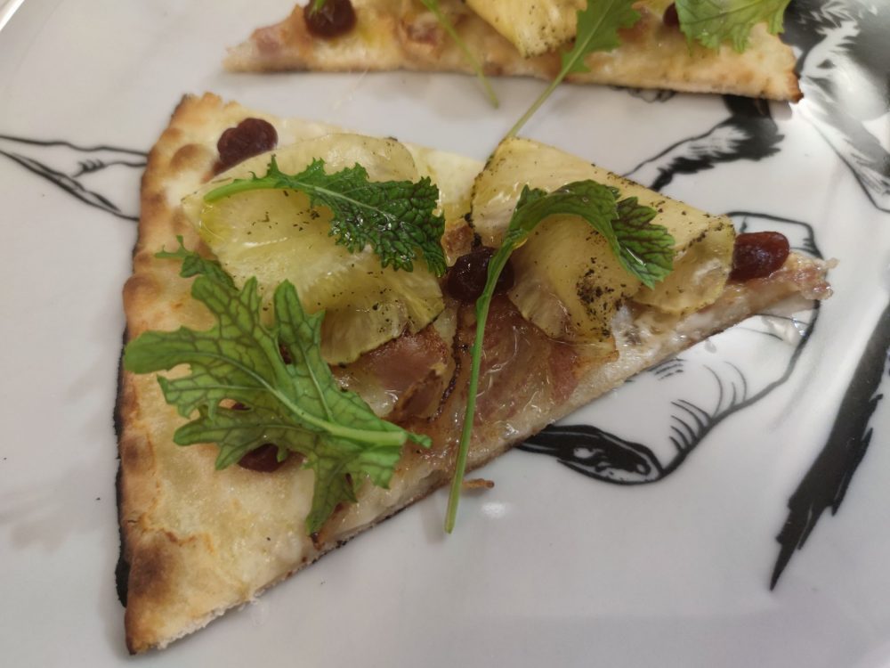 La Pineapple Express (14€) potrebbe essere considerata quasi un pre dessert: fior di latte, guanciale, pastrami di ananas, gel di angostura e chinotto, senape riccia. L’idea di Jacopo è stata quella di fare un pastrami di frutta, lavorato come se fosse carne. L’ananas viene messa in salamoia, coperta e massaggiata con pepe, cumino e spezie, tenuta aperta per disidratare. Viene poi cotta a bassa temperatura per cinque ore, affettata e affumicata. L’effetto sulla pizza è frizzante, provocatorio.
