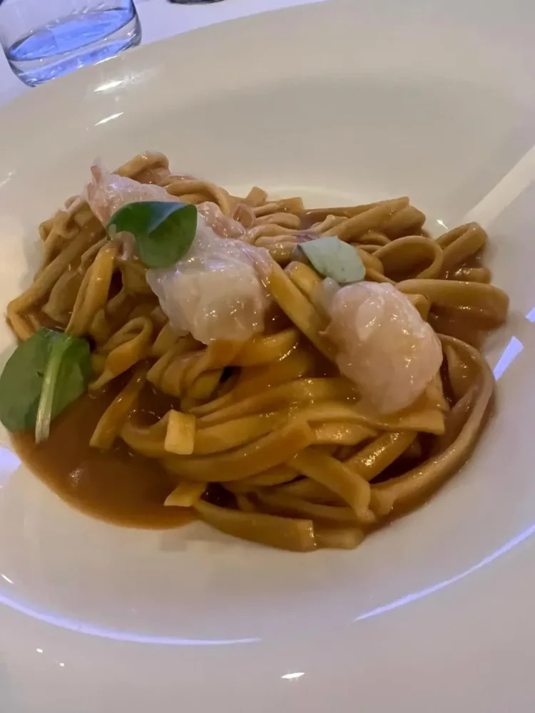 La gestione è familiare. Cordiale e gentile il servizio; una carta dei vini che racconta solo una parte di quello che si vede esposto; tutto lascia pensare che, anche in cucina, ci sia più sostanza di quello che a primo impatto si potrebbe immaginare. Si avvicina il patron, uomo sui sessanta con marcato accento Lombardo: che ci fa un discendente di Alberto da Giussano a questa latitudine? Inutile chiederlo! Basta guardare lo sguardo della moglie che lo segue in ogni suo gesto. Per amore, solo per amore. Intanto Pedro, che con grande sorpresa, scopriamo essere Portoghese, inizia a raccontarci cosa potremmo mangiare, cercando di venire incontro ai gusti di tutti i commensali, con grande disponibilità ed attenzione. In cucina, già da qualche anno, c’è Domenico Grasso, di Lucera, esperienza maturata anche all’Oasis di Vallesaccarda. Si percepisce che c’è tecnica dai piatti che vediamo uscire per gli altri tavoli. Il menu spazia tra terra e mare, con pochi piatti, come giusto che sia.