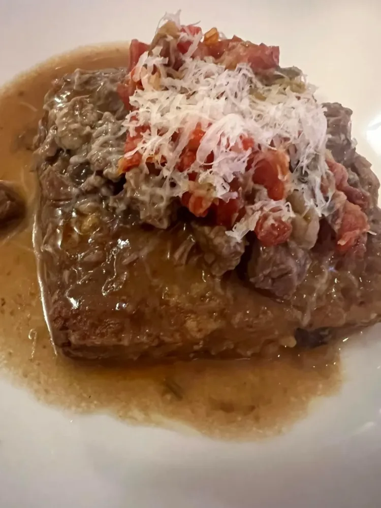 5 sensi – riso al salto al ragu bianco di manzo con peperoni, capperi e caciocavallo