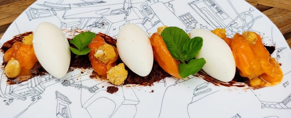 Dessert Made in Capri albicocche di Cesina ricotta arancia di Matermania e crumble di nocciole