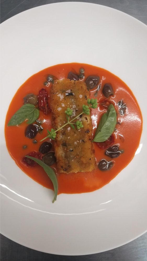 Ristorante Villa Margherita – Baccala’ fritto in crosta di pane alle alghe scarola saltata pesto e olive nere
