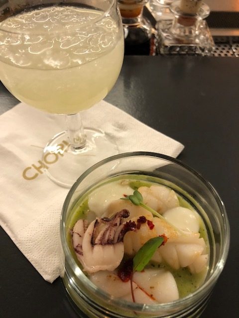 Dalle grandi vetrate della sala rettangolare tutta marmo e divanetti decò si intravede il cupolone sulla destra e Castel Sant’Angelo sulla sinistra, sotto uno sciame di fedeli calpestano la strada che porta dal Papa. Sarà la musica, l’ambiente ovattato, lo scintillio degli specchi, i movimenti ritmici dei camerieri, i sorrisi che quasi non sembra di stare a Roma ma in un’altra città europea dove questo tipo di locale è più diffuso. Per la serata di presentazione di Accademia Chorus che ha tra gli sponsor il gruppo Lunelli e come Media partner dell’iniziativa Gambero Rosso Food& Wine Academy sono stati offerti quattro cocktails a base gin preparati da D’ Addezio e la barlady Solomya abbinati a diversi piccoli piattini dello chef Andrea Sangiuliano. Mojto con calamaro su crema di zucchine e anduja; French 75 ( sparkling in cui il vino viene miscelato con il limone) con tartare di orata e limone;
