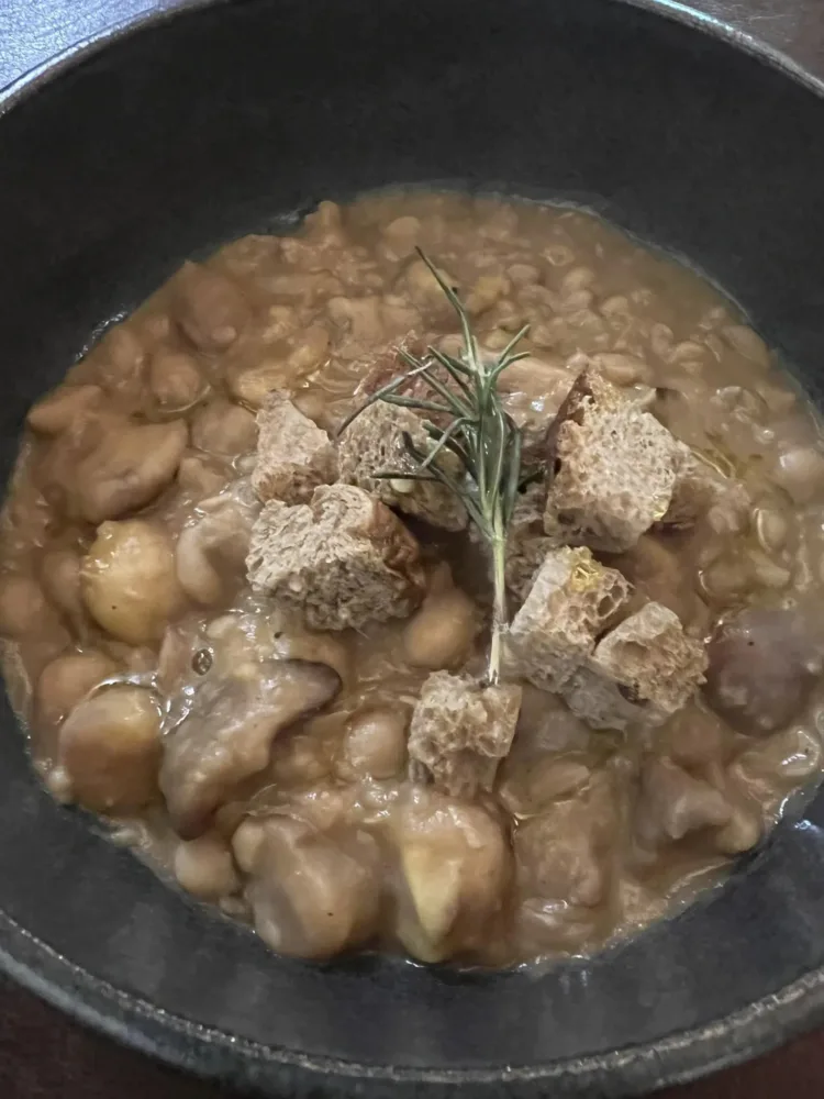 Zuppa di fagioli e castagne è un altro di quei piatti che vorrei sempre trovare, nei fuori porta invernali. Qui c’è ancora un po da lavorare, per il mio gusto:l’equilibrio non è centrato; la castagna, in quantità eccessiva, “sposta” troppo verso il dolce.