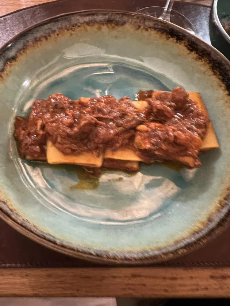 La cucina a vista, rende partecipi dell’attività dello chef, mentre opera tra i fornelli. Lo vedo spesso rivolgere attenzione particolare ad un pentolone. Con curiosità “morbosa” chiedo cosa stesse cucinando e di rimando mi viene chiesto se volessi assaggiare: potevo mai dire di no? Nonostante l’ora, faccio affidamento sulla capacita di ruminare anche le pietre, che il mio stomaco ha acquisito in anni di allenamento. Un pacchero diviso due. Qui l’anima rurale dell’osteria si supera.