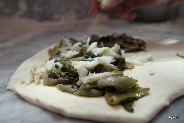 Tra le sue mani diventa un calzone ripieno: scarola stufata con alici, olive di Gaeta e Tonde di Spagna, capperi, pinoli, uva passa.