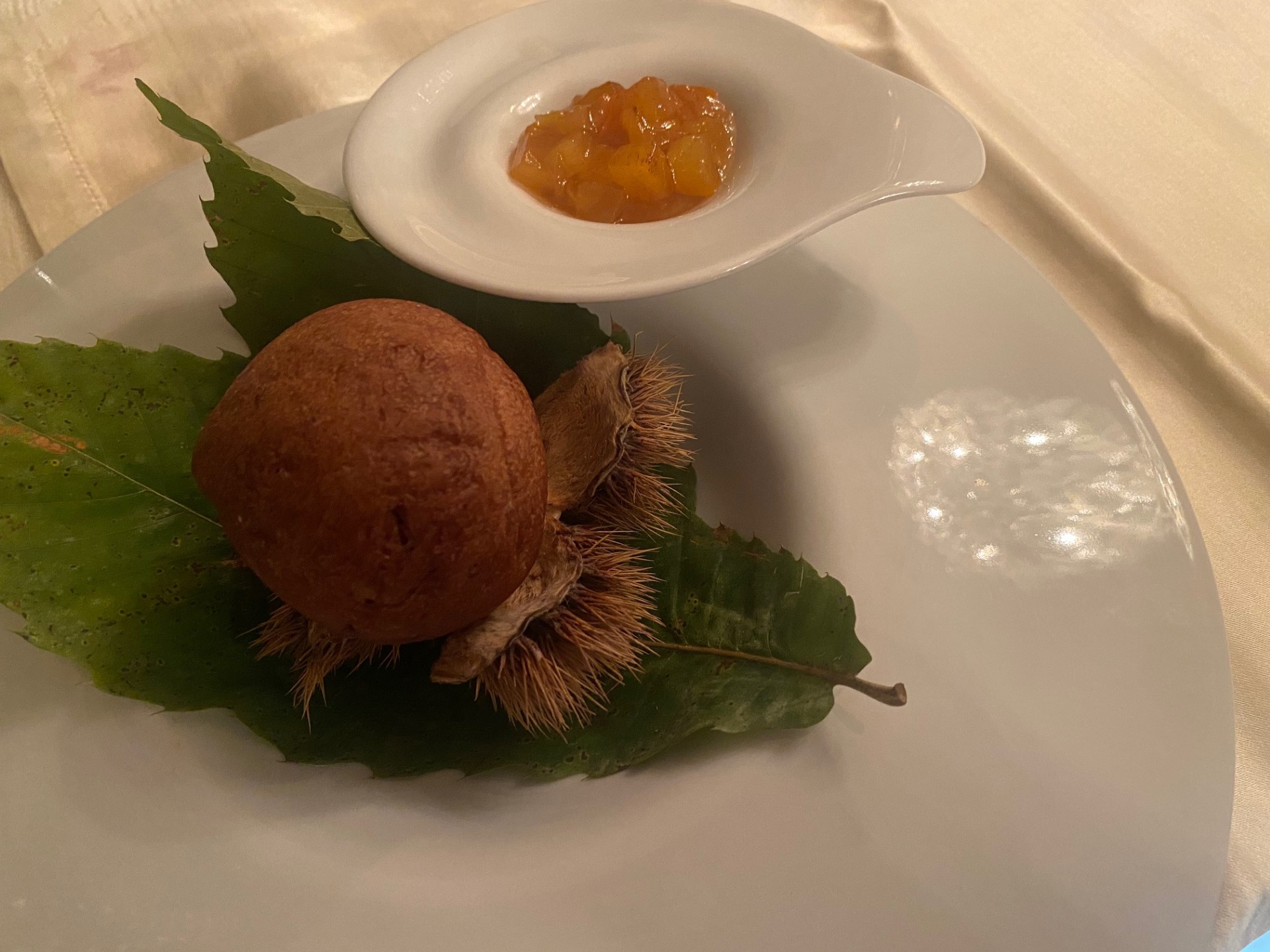 Una sfera di pan brioche, aromatizzato e ripieno di crema alla castagna con cuore di caldarroste, presentato su un autentico riccio di castagne con relative foglie. Il tutto da mangiare rigorosamente con le mani intingendo nel mix di cachi in doppia consistenza: in crema e in osmosi di cachi mela.