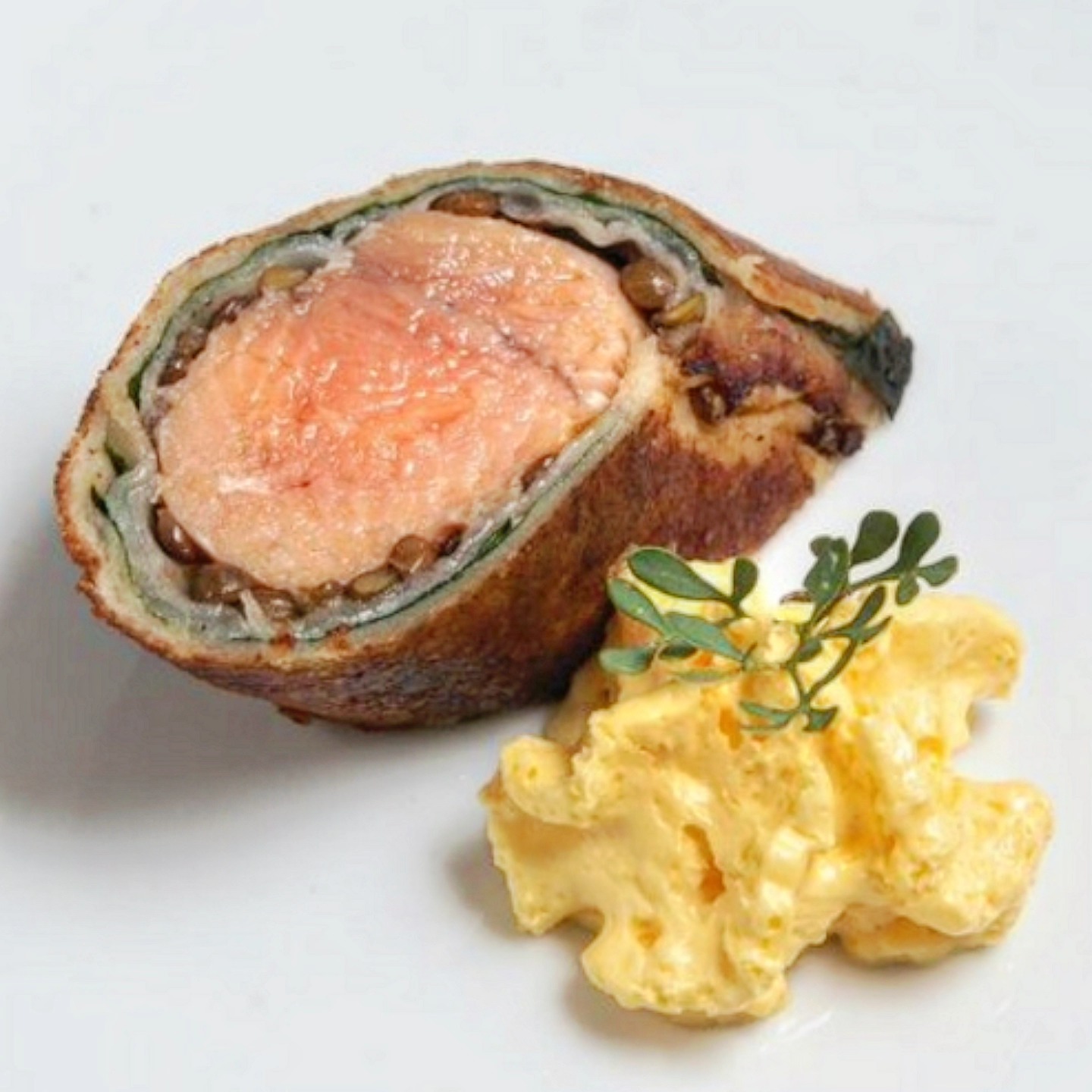 La trota alla Wllington con le lenticchie è quel piatto che non ti aspetti ma che ti sorprende. Un piccolo boccone a diverse densità che stuzzica il palato e convince.