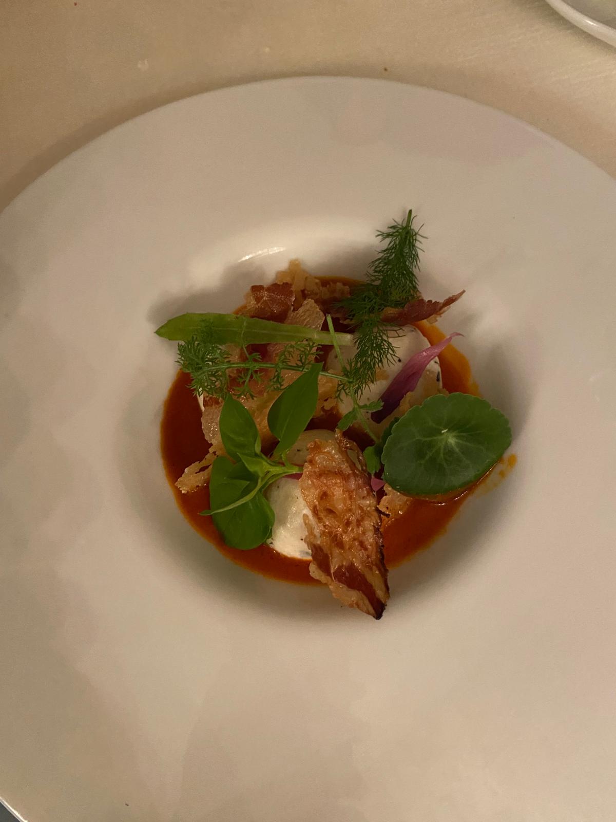 Proseguiamo con i primi: gnudi di ricotta di pecora con salsa all’amatriciana, guanciale croccante e cipolla rossa utilizzata a mo’ di decorazione dopo essere stata sottoposta a osmosi con l’aceto di vino rosso. A completamento del piatto la cialda di pecorino romano.