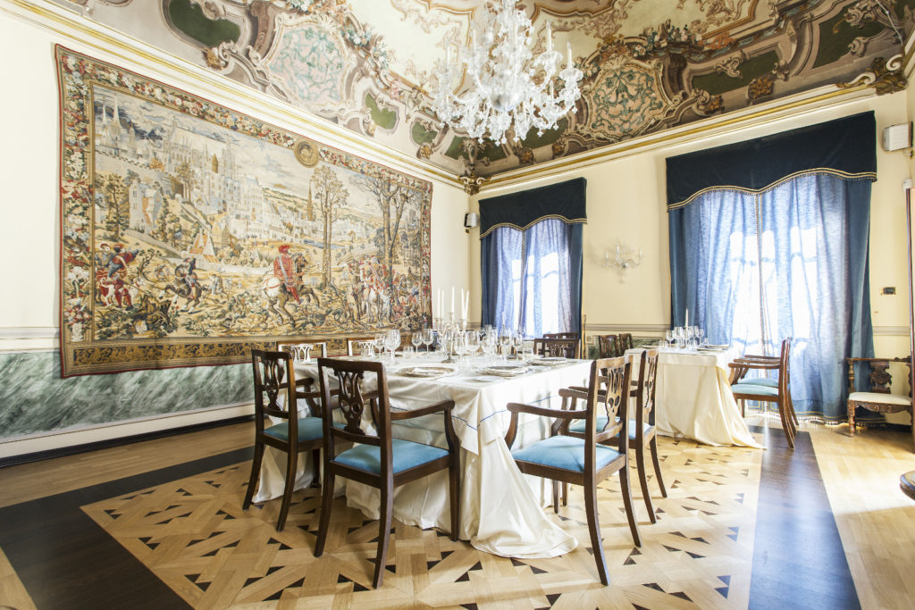 Le sale sono magnificamente affrescate e impreziosite da sontuosi lampadari in vetro di Murano: un salto nel tempo di 1500 anni, dunque, passando dalla domus, alle sale medioevali fino agli splendidi affreschi rinascimentali.