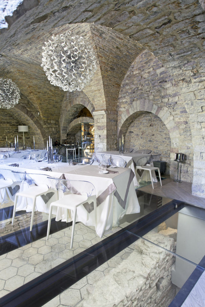 Dall’imponente ingresso si accede direttamente alla prima sala di epoca medievale con bellissime volte in pietra, ma la vera meraviglia è lo spazio sottostante: una domus romana del 70 a.C., protetta da un pavimento in vetro. I mosaici perfettamente conservati fanno parte del pavimento a base litica decorato con originali inserzioni, un museo a cielo aperto che si può ammirare solo entrando nel ristorante.