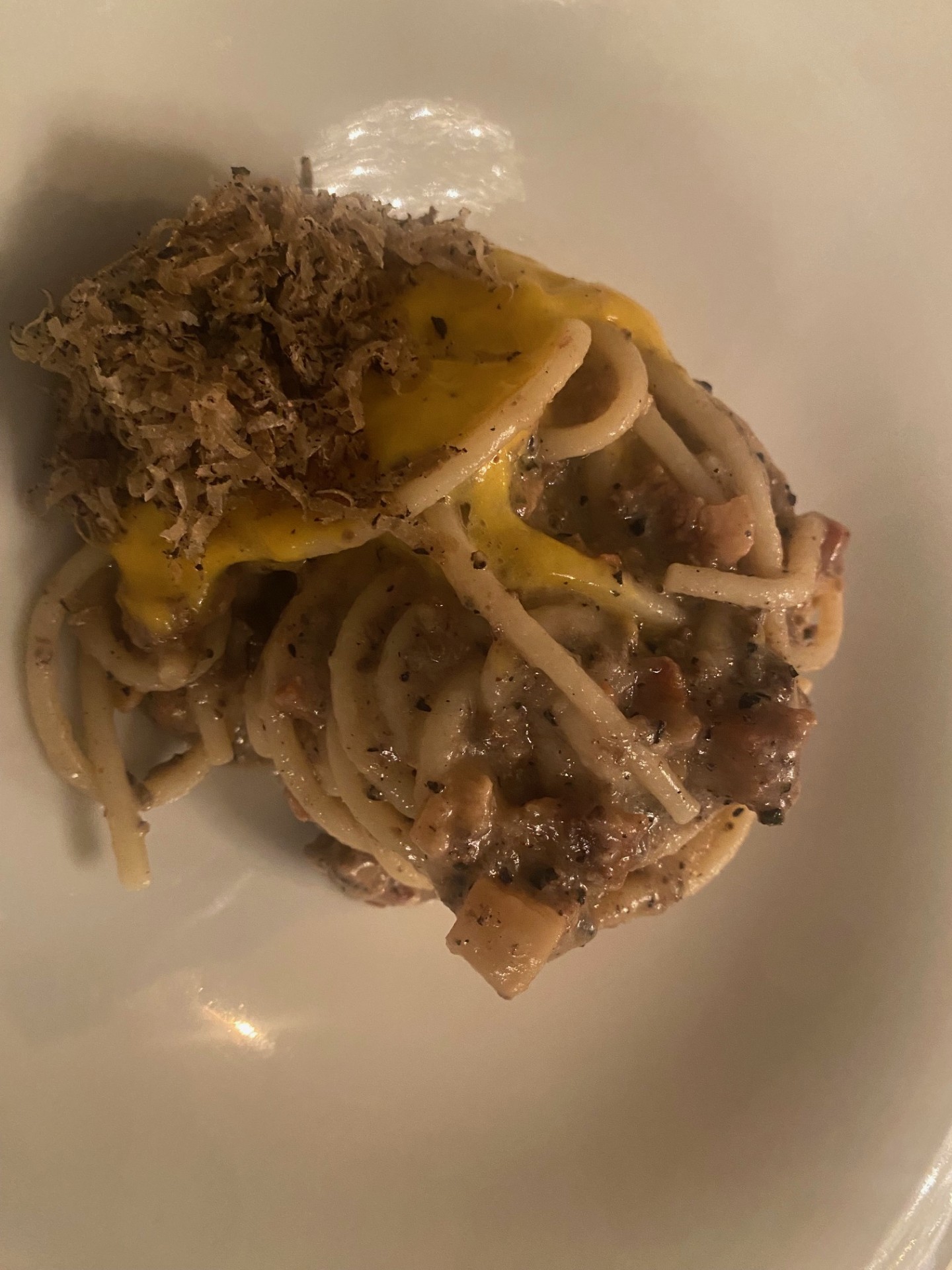 Ci ha molto incuriosito Lo Spago: spaghettone alla gricia, spuma di carbonara e tartufo uncinato. Tutti i grandi classici della cucina laziale in equilibrio perfetto.