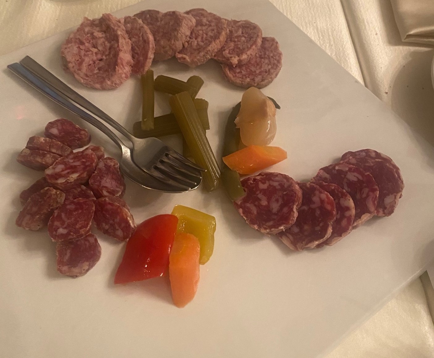 Irrinunciabili le norcinerie, salumi da suino allevati allo stato brado, salsiccia e ciauscolo, ed i formaggi, da quelli umbri, magnifico il blu di capra affinato nelle amarene, a quelli siciliani con qualche inclusione internazionale come il Comtè, 27 mesi di stagionatura.
