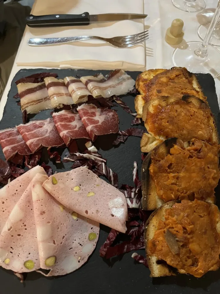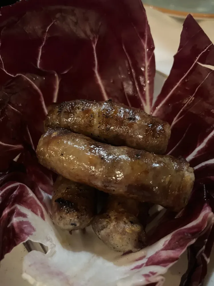 E Maiale dei Nebrodi sia pure lo stinco tenerissimo, la gustosa salsiccia a punta di coltello, e la pancetta in duplice versione, in bianco con spezie orientali o stufata al sugo, per me piatto del viaggio di stasera.