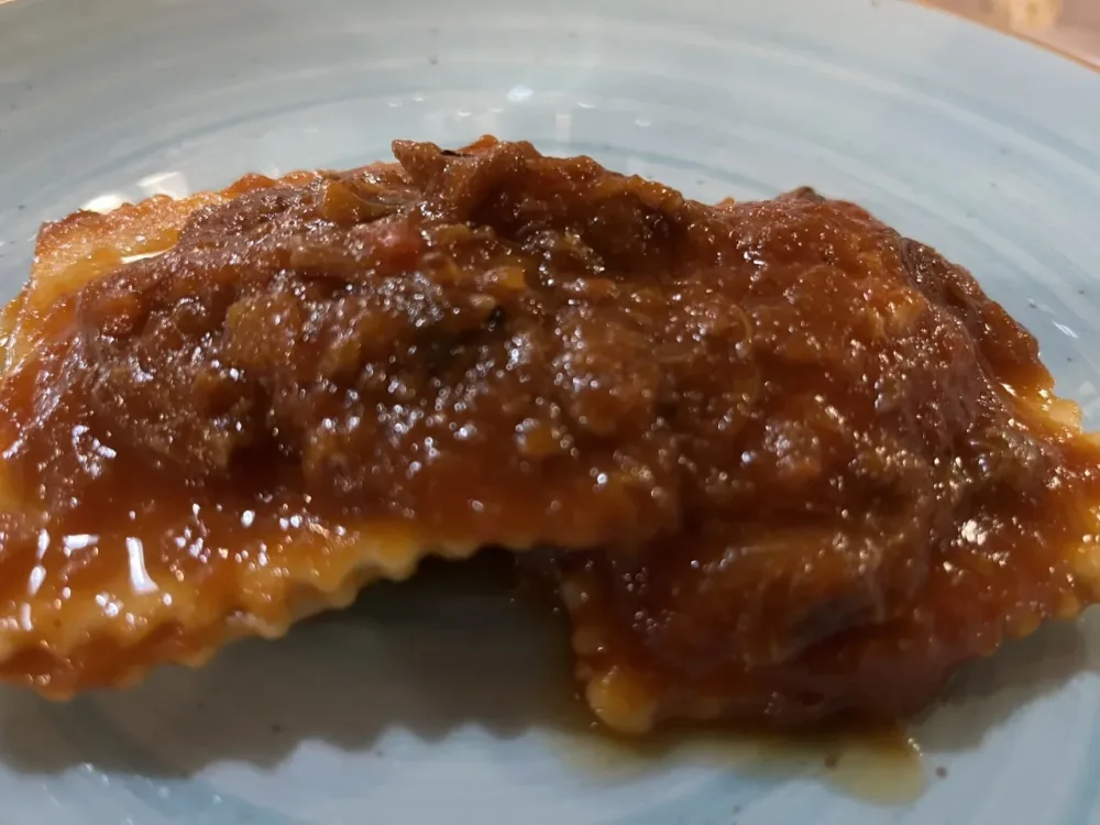 Supplico Flavio che il primo sia un assaggio, deve restare posto nello stomaco per i secondi perché siamo pur sempre una classe di analisi sensoriale dei salumi e delle carni, e quindi i ravioli fatti a mano saranno due ma saranno ottimi, con un ragù maialoso saporito e tirato come piace a me.
