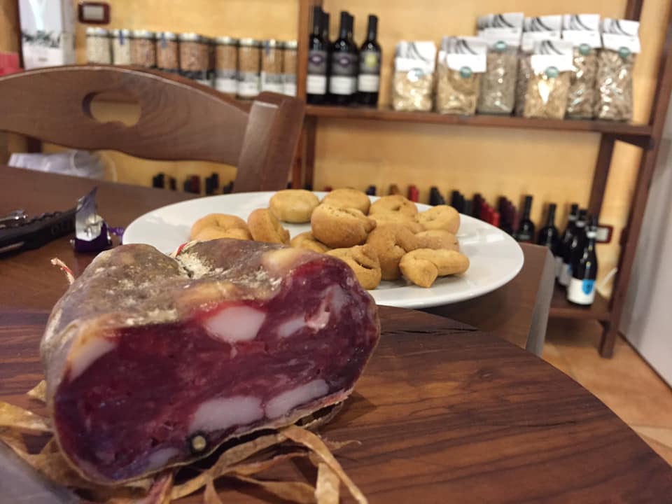 Esagero? Parliamone. Innanzitutto ci lavora una famiglia intera, 3 generazioni che si danno da fare ognuna con un suo compito: c’è chi alleva, chi coltiva, chi trasforma, chi cucina, chi si occupa del ristorante. Avere tante braccia permette, di produrre il 100% di quello che si somministra, una percentuale irraggiungibile per la quasi totalità degli agriturismi italiani: salumi, formaggi, carni fresche, olio, legumi, verdure, cereali, pasta, pane, farine, conserve, infusi, tutto è fatto in azienda. TUTTO. Si allevano mucche, maiali, capre, animali da cortile. Si fa un ottimo olio biologico e ben due presidi slow food, il cacioricotta e le olive ammaccate.