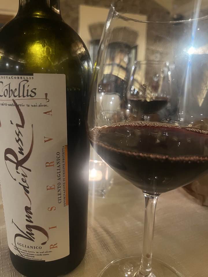 Io entro e scelgo personalmente il Vigna dei Russi Riserva 2013 di Cobellis, che, scaraffato, dopo circa un’oretta si apre con meravigliosi profumi di ciliegia sotto spirito e frutti rossi maturi. Va lasciato ambientarsi almeno 60 minuti, ergo, nel frattempo, bevete altro.