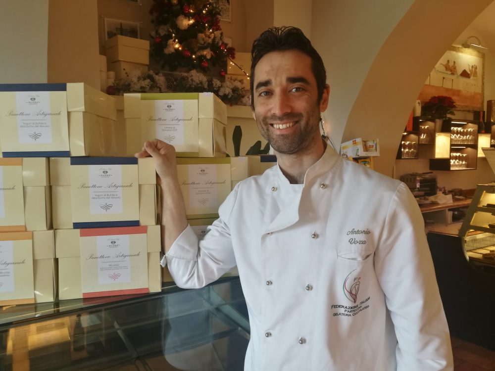 “Ti devo far assaggiare il mio panettone, voglio il tuo parere!” Questa è la frase che mi ha detto qualche mese fa Antonio Voza del Bar Museo di Paestum. Episodi del genere, grazie alla mia quasi cinquantennale esperienza nel mondo della ristorazione, francamente, mi capitano spesso. Non mi considero un esperto di panettoni, ma conoscendo Antonio e il papà Vincenzo non avevo dubbi sulla qualità del prodotto. Così qualche giorno fa, Antonio mi ha regalato uno dei suoi panettoni artigianali, quello chiamato “tuttuvetta” con uva sultanina australiana 6corone. Volendo un mio parere celermente, la mattina dopo ho aperto il panettone e ho fatto un’analisi che descrivo con parole mie. L’aspetto è molto invitante, anche nella confezione. La forma è regolare. Tagliato una fetta, la guardo e vedo una distribuzione uniforme dell’alveolatura (la porosità della pasta dovuta all’anidride carbonica che si sviluppa durante la fermentazione). I fori (o le bolle) interni sono piccoli, segno di una corretta e naturale lievitazione. L’uvetta è presente in modo omogenea. Il tutto promette bene. La crosta è di colore dorato scuro, la pasta interna ha il colore delle uova: giallo carico. L’odore è gradevole, direi invitante, intenso e non invadente. È soffice, assaggiandolo risulta facilmente solubile, non è pastoso (o gommoso). Una fettina tira l’altra! Il gusto è armonico, non è troppo dolce e lascia un piacevole retrogusto. Con un piccolo aiuto di mia moglie, l’ho terminato in giornata. Ho trovato una leggerezza e una digeribilità unica. Veramente un panettone artigianale da manuale. Dopo soli due giorni, sono passato al Bar Museo per complimentarmi e … per acquistare 3 panettoni. Ho avuto l’impressione come se il panettone mi avesse creato dipendenza. Ho colto l’occasione per scambiare qualche chiacchiera con Antonio, anche per conoscerlo meglio. Da piccolo è stato al Bar Museo che, come è noto, ha una lunga tradizione sul gelato di qualità. Subito si è appassionato a questo lavoro. Si specializza, in particolare, nel settore della produzione del gelato artigianale. Pignolo come pochi, da sempre ha puntato sulle materie prime di qualità e di stagione. In seguito, seguendo la stessa filosofia di produzione del gelato, ha iniziato a produrre torte gelato, semifreddi, yogurt e budini al latte di bufala, confetture di frutta, gelatine di frutta, creme spalmabili, biscotti, paste di mandorla e non per ultimi lievitati da ricorrenza quali panettoni e colombe. Ha al suo attivo numerosi corsi di formazione e specializzazione sotto la guida di alcuni tra i più importanti nomi della gelateria e della pasticceria. Mi ha spiegato il segreto della bontà del suo panettone: è realizzato con sola pasta madre, senza aggiunta di lieviti di qualsiasi natura. Sono utilizzati solo aromi naturali che ne consentono l’alta digeribilità. Non ci sono emulsionanti e conservanti. Solo ingredienti singoli, senza l’uso di preparati o miscele in polveri. Insomma, come dovrebbe essere. Ha iniziato a produrre panettoni quattro anni fa ed ha ottenuto questo risultato dopo tantissime prove. Lo scorso anno ha prodotto circa 600 pezzi, quest’anno qualcuno in più. Quindi, un vero artigiano. Pensate, alcune aziende producono decine di migliaia di panettoni. In realtà sono poco artigianali e sono poco meglio dei prodotti industriali. Antonio produce 13 tipi di panettoni che vanno dal tradizionale, al Milano, con cioccolato, con i fichi (cilentano), pistacchio di Bronte e mandarino, al caffè, ecc. Il prezzo? Quelli da 1 kg costano solo 25 € che, guardando i prezzi di aziende blasonate, sono un vero affare!