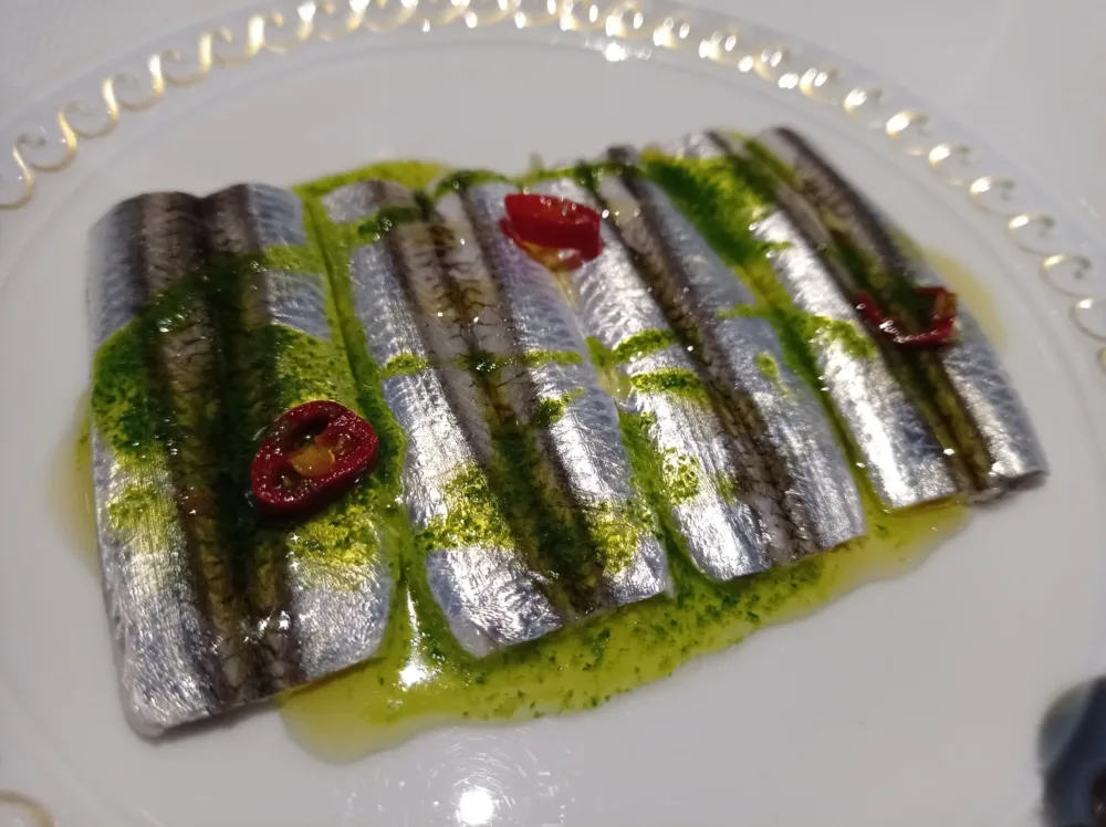 Alici marinate al limone con clorofilla al prezzemolo e peperoncino. Ottima esecuzione, divertente, fresca e godibile.