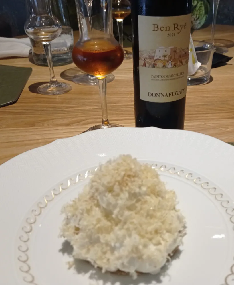 In accompagnamento sono stati proposti tre ottimi vini: Dubl Spumante Brut Rosé Metodo Classico Feudi di San Gregorio; Efeso Bianco Calabria Mantonico Librandi; Ben Ryè Passito di Pantelleria Donnafugata.