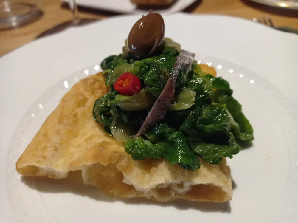 Pizza fritta con scarola ripassata, alici salate ed olive nere. Trancio di pizza molto croccante, ottimamente lievitato e non affatto unto. Nell’insieme è davvero gustoso.