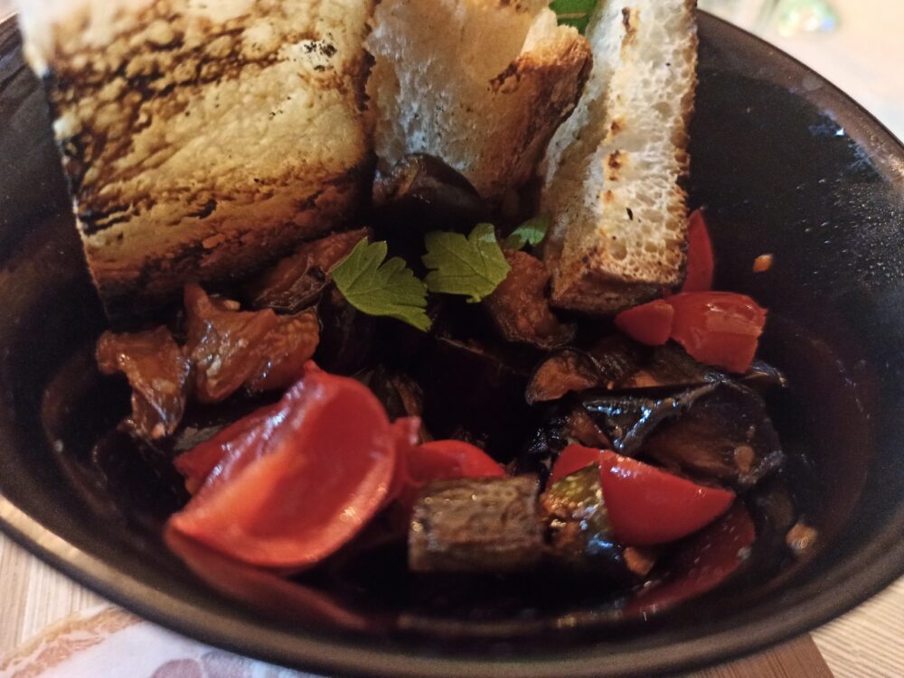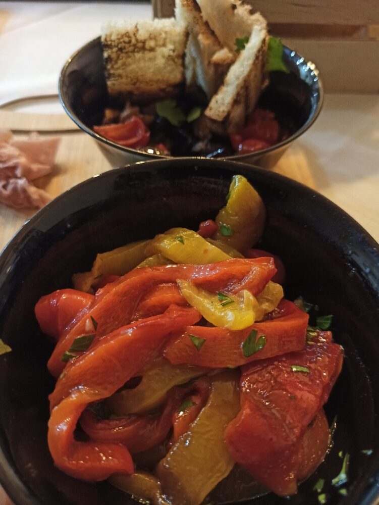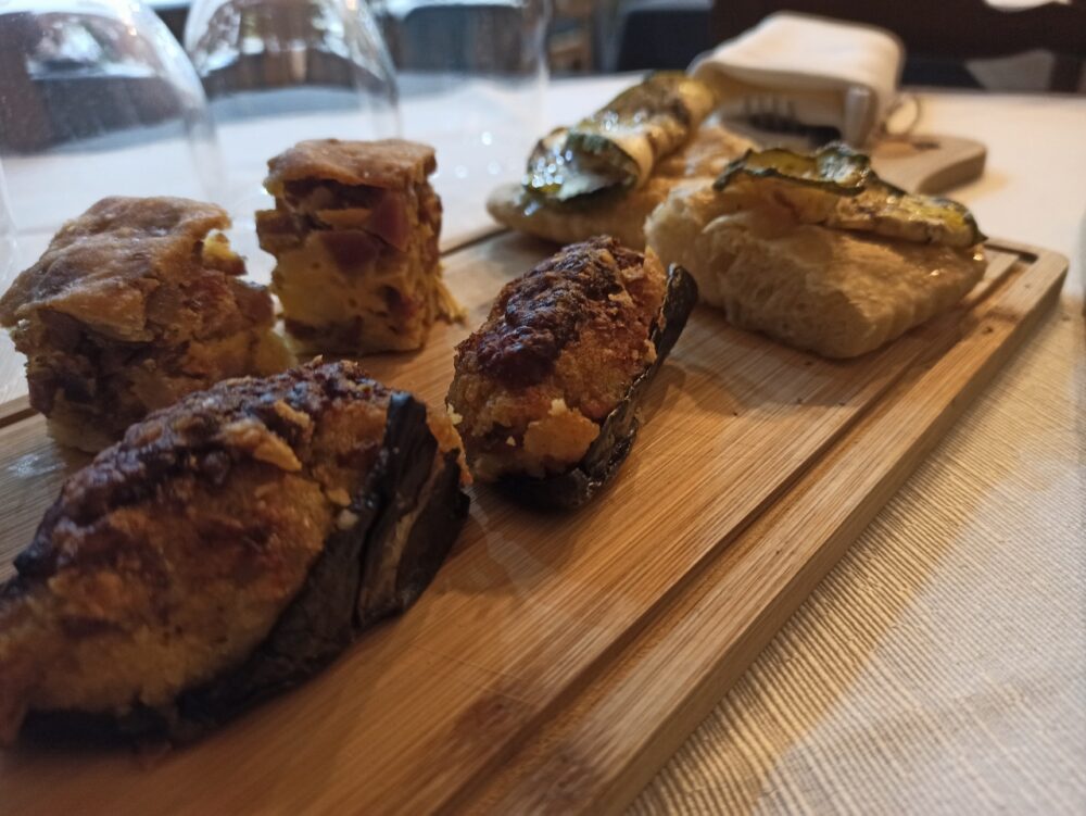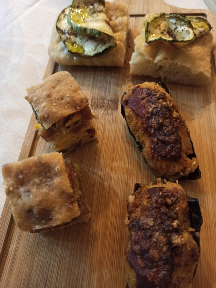 la Pancetta Coppata, il Guanciale, la Pancetta pepata, la Salsiccia secca e una sorta di Finocchiona); -dei pezzetti di Caciocavallo di pezzata rossa; -delle ciotole con Melanzane a funghetti e Peperoni all’insalata; -e taglierino con preparazioni calde ( quadrotti di Pizza Chiena, Melanzane imbottite e Focaccia con Zucchine grigliate esaltate dall’ottimo olio locale).