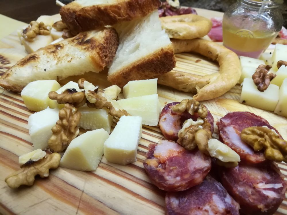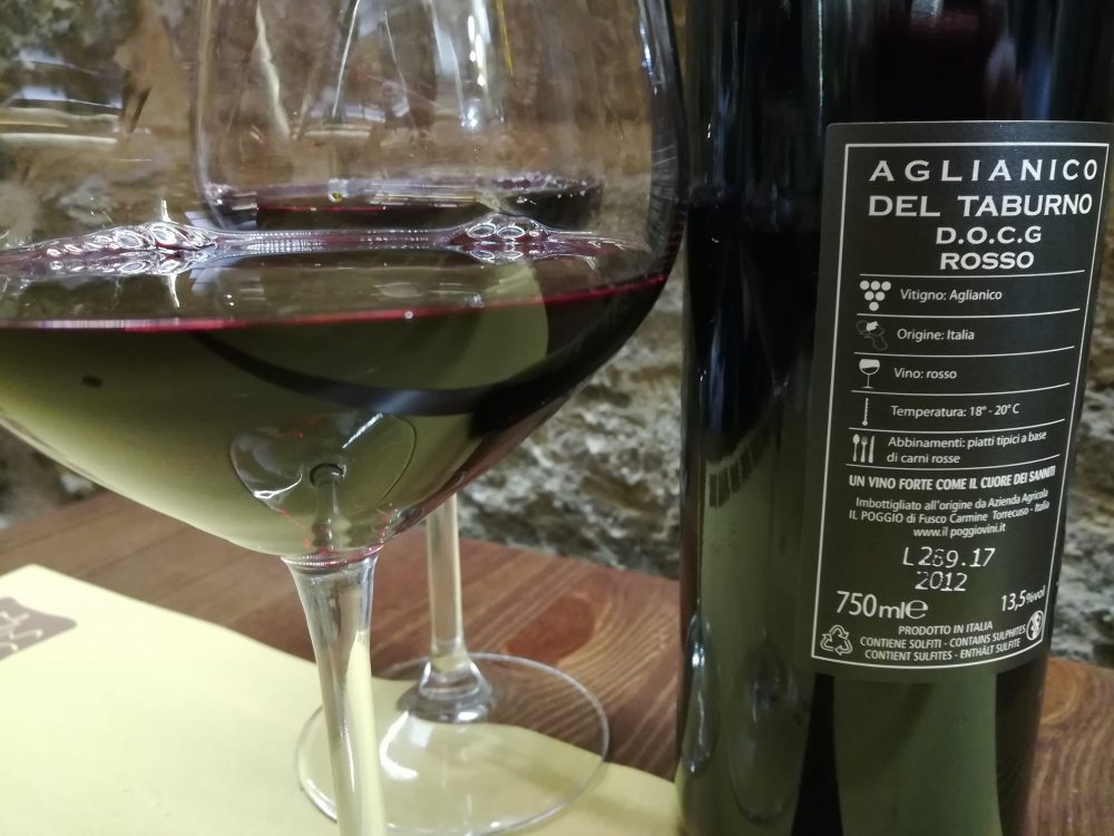 Decidiamo dunque di gustare alcuni prodotti al tagliere accompagnati dal bel Aglianico del Taburno Docg Safinos della “Cantina il Poggio” di Torrecuso. Il primo tagliere è composto da salsiccia dolce e piccante “Di Maria”, crudo di Sepino tagliato al coltello, caciocavallo al Tartufo “Ciarlo”, Pecorino al peperoncino e pecorino stagionato sempre “Ciarlo”, miele di acacia “Santopietro”, noci e i buonissimi taralli beneventani.