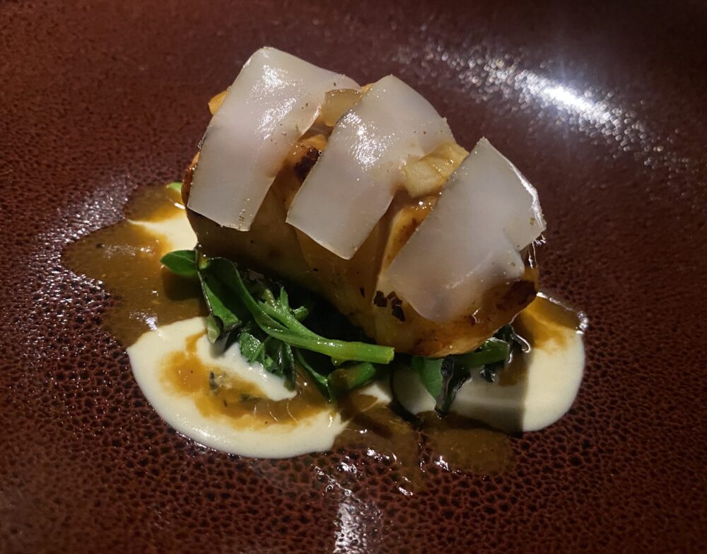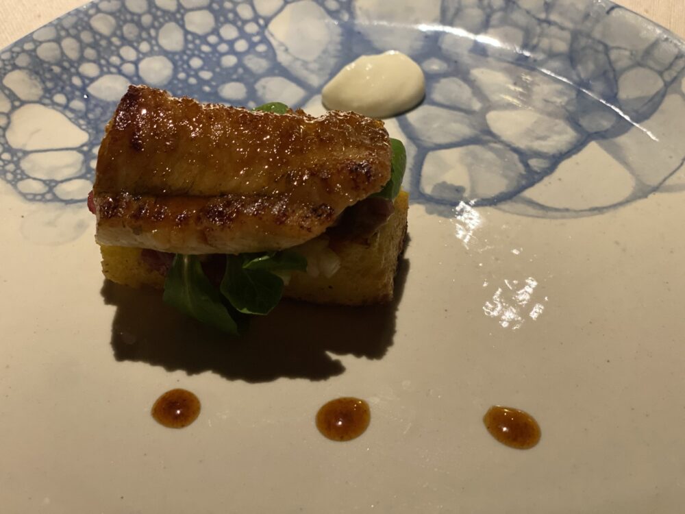 Territorio ripensato con intelligenza in un altro piatto deflagrante: anguilla laccata con riduzione di Gewurztraminer e aceto balsamico di mela, con fegato alla veneziana di coda di rospo. Ovviamente il riferimento è all’anguilla unagi giapponese con il classico piatto del Doge che gli fa da contrappunto. Eccellente.