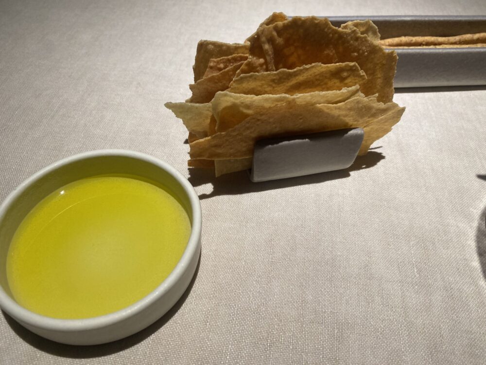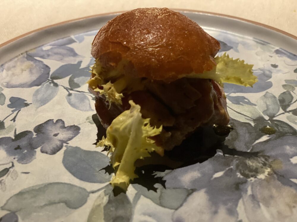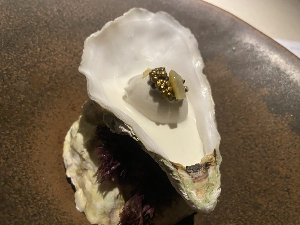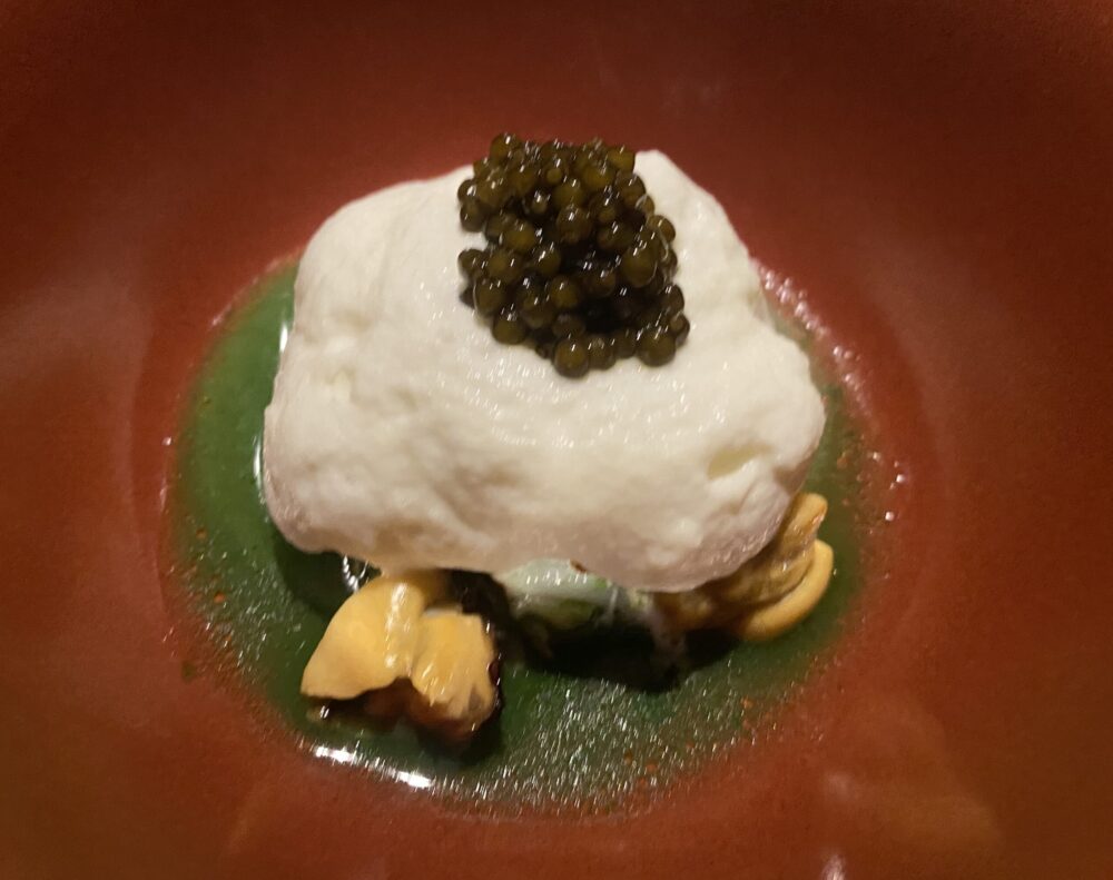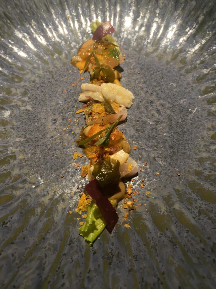 Il percorso di degustazione ha mostrato un perfetto equilibrio tra la qualità eccelsa della materia prima che è sempre rispettata, la capacità di estrazione dei sapori con approccio quasi ispanico, gli inserimenti esotici mai banali né inutilmente citazionisti, la lettura del territorio in chiave assolutamente moderna.
