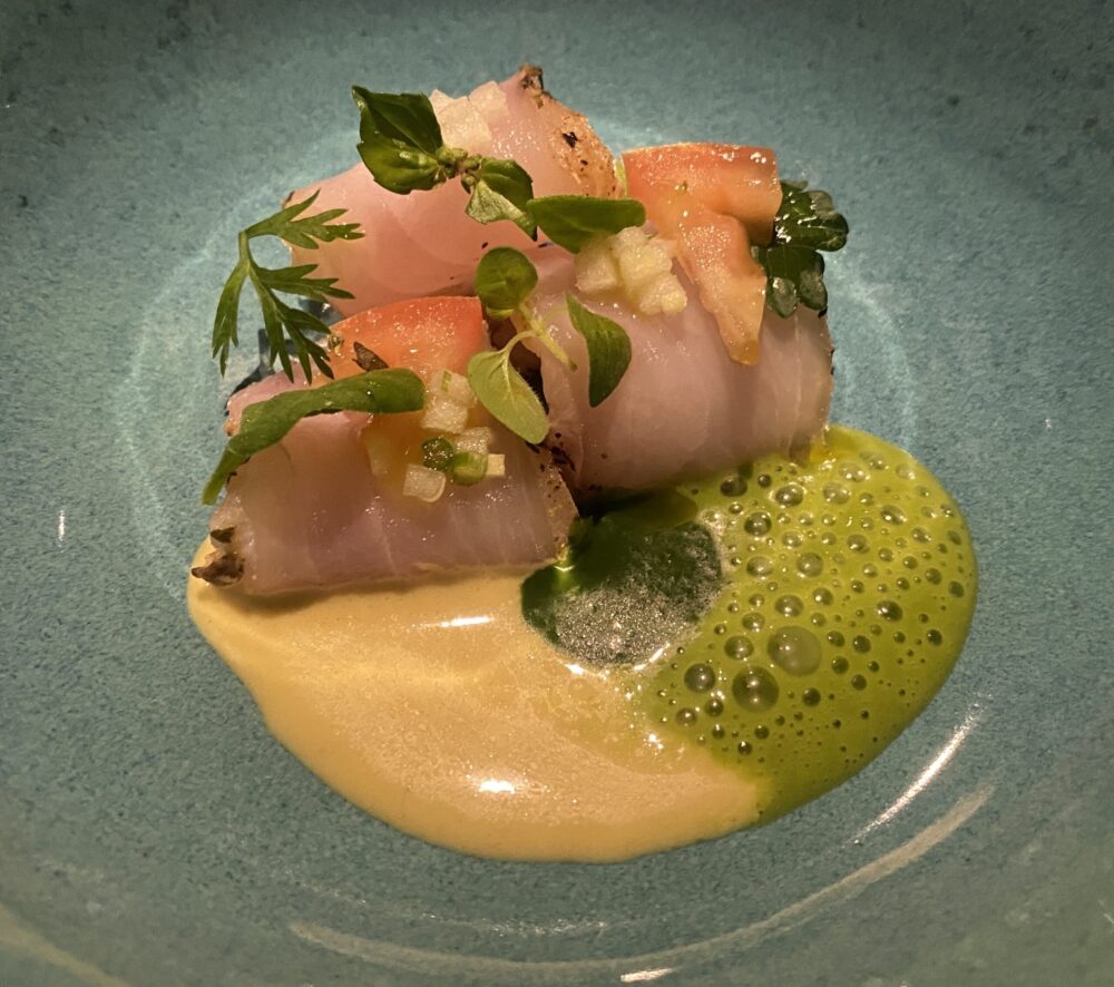 La ricciola al fumo di erbe e miso bianco con succo di pomodoro verde e zafferano ha echi della cucina robata giapponese, suggestione nipponica che troviamo anche nella capasanta con caviale kaluga amur, tosazu e linone salato.