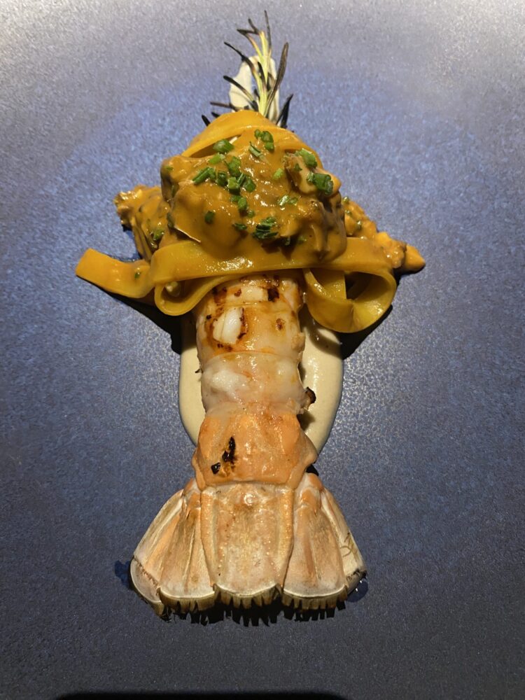 Lo scampo al rosmarino è servito con dieci grammi di pasta con le sarde e una bisque di champagne, la testa dello scampo a parte che è da mangiare come una caramella, tanta è la sua dolcezza (qui torniamo al principio della grande materia prima che secondo Marchesi dovrebbe essere l’ossessione di ogni grande chef italiano).