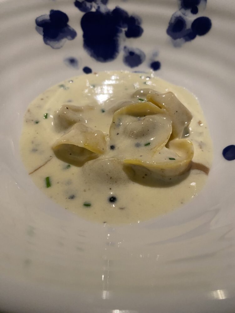 Dopo gli amuse bouche di rito, tutti sapientemente centrati, l’inizio è deflagrante con i Tortellini Panna e Aringa (più riduzione di funghi shitake e caviale di aringa), che noi frequentatori delle latitudini emiliane ritroviamo con il medesimo senso di “gola” che troviamo –per esempio-per non fare nomi- alla tavola di Franco Cimini a San Giovanni in Persiceto. Solo declinati in versione di mare. Da mangiarne un catino, per capirci.