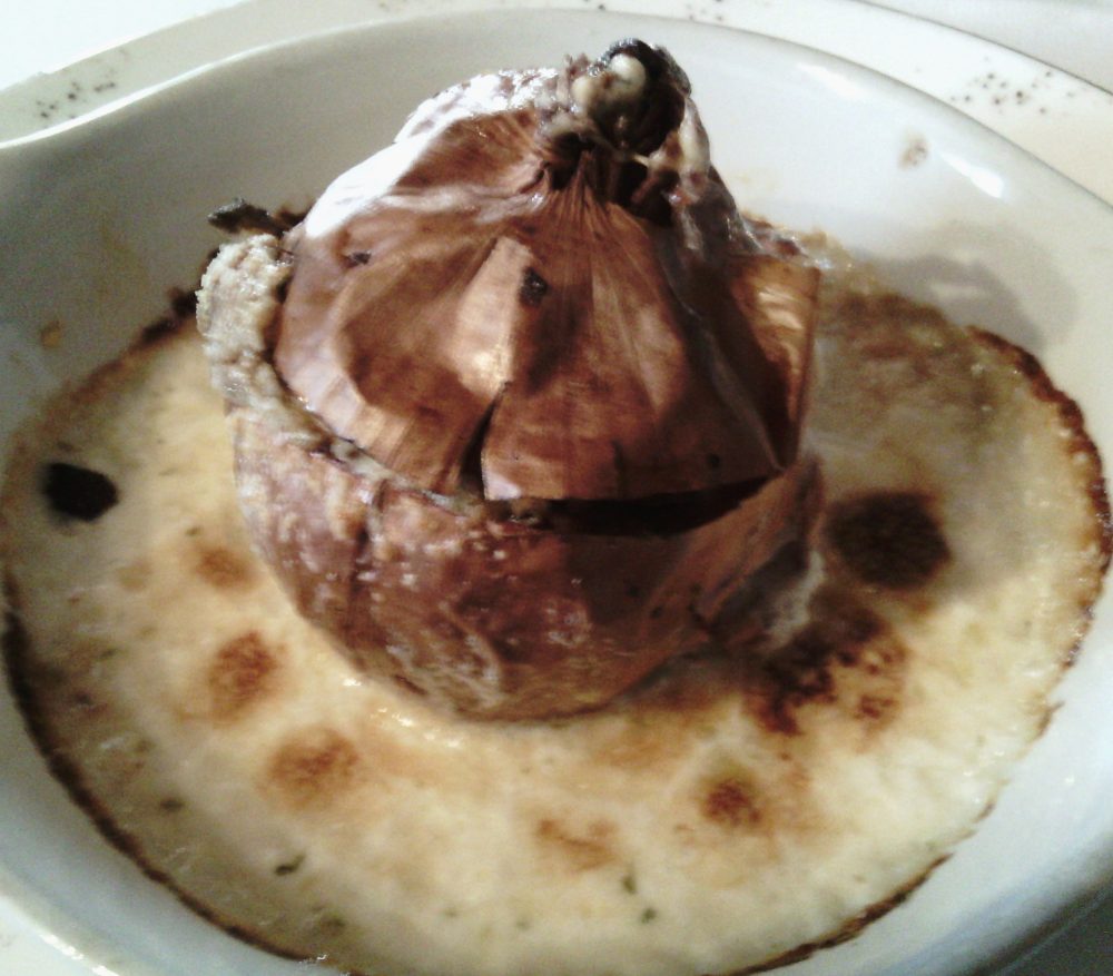 Antica osteria del Mirasole, Cipolla infornata ripiena di fegatini di coniglio su crema di parmigiano