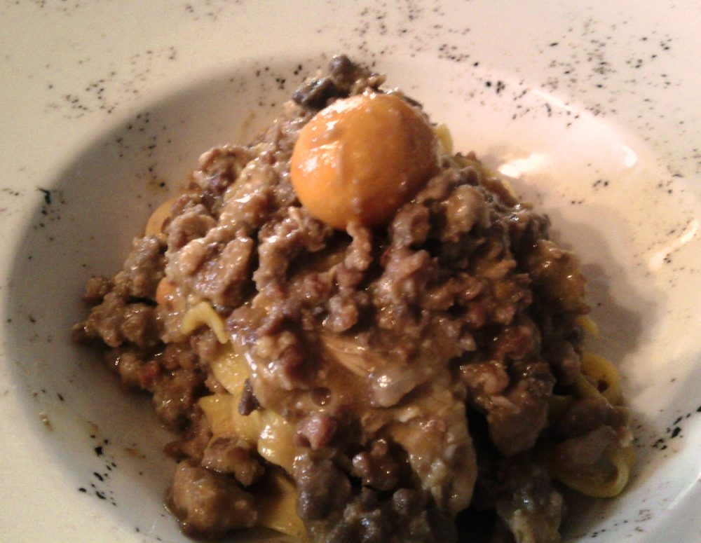 Qui è proposto battuto al coltello alla maniera del contado del persicetano; un misto di carne di manzo, lardo e o pochi odori, a cui vanno aggiunti battuti a coltello le carni e le interiora dei vari animale che un tempo razzolavano per i cortili, infine come ciliegina, un’ovarina ( uovo di gallina embrionale) cremosa posta al centro del nido di fumanti tagliatelle giallarancio, dalla callosa e profumatissima sfoglia.