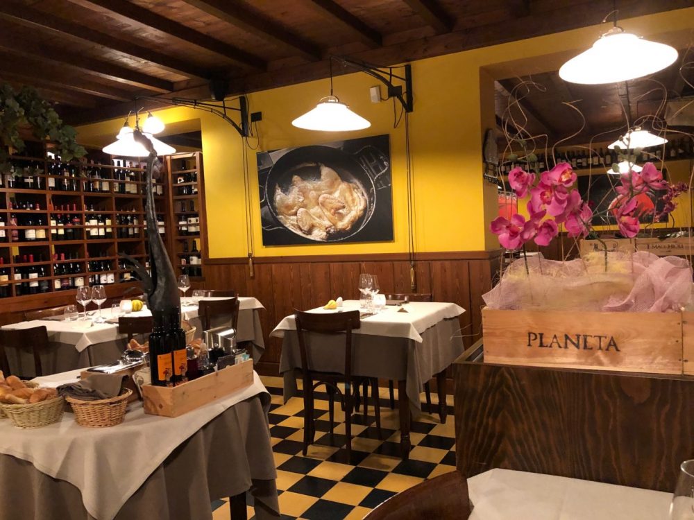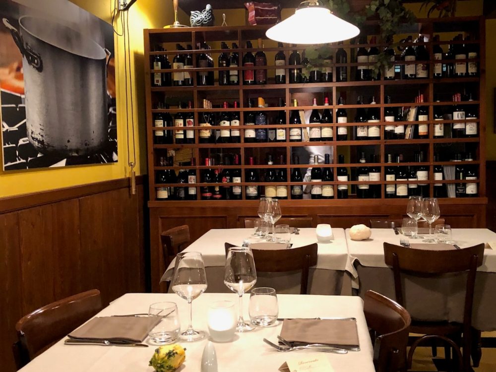 Antica Trattoria del Gallo, tavoli, vini e mise en place, armonia e calore di fondo
