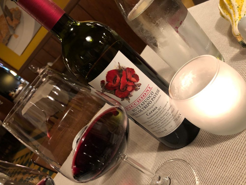Antica Trattoria del Gallo, il vino della serata, Oltrepò Pavese Cerasa, rubino con riflessi violacei, il vino è morbido, persistente, adatto a tutto pasto principalmente con piatti saporiti.