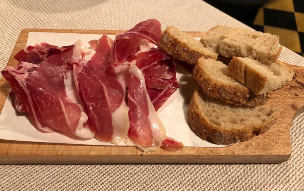 Antica Trattoria del Gallo, un assaggio di paleta iberica servita con pane caldo e gentilmente offerta