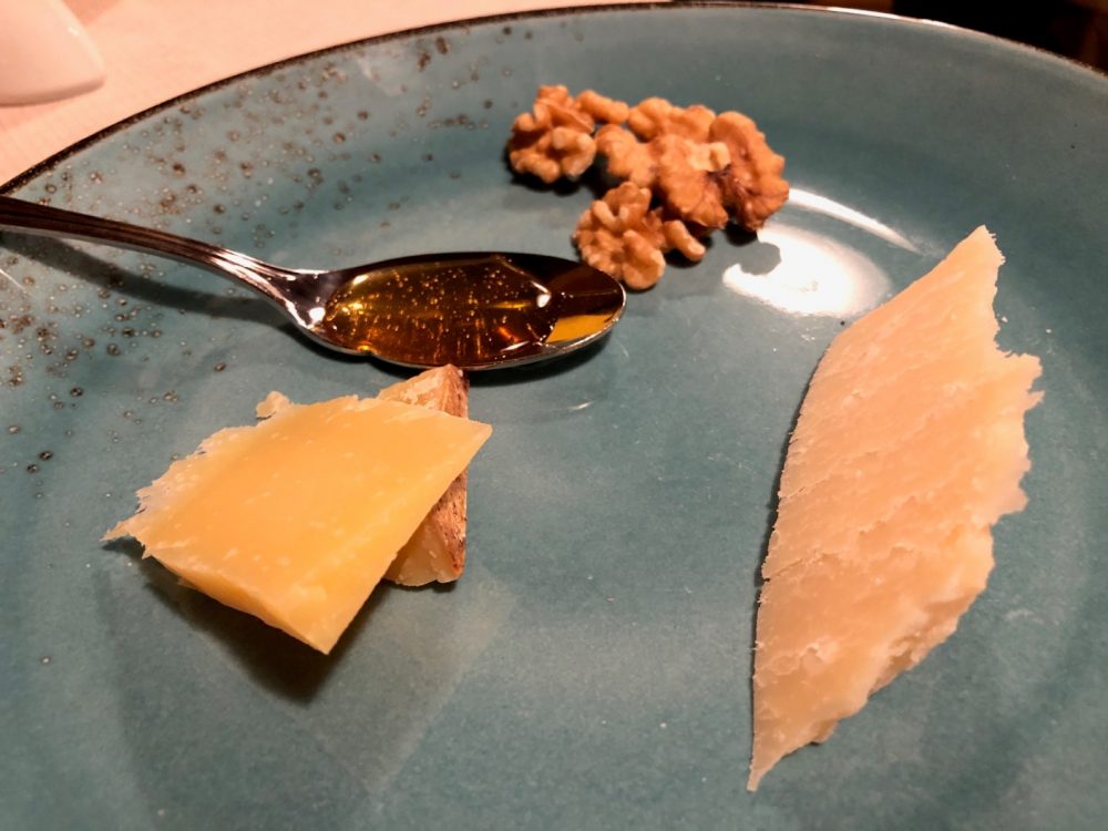 Antica Trattoria del Gallo, l’assaggio di formaggi: bitto stravecchio, parmigiano vacche bianche Caseificio Rosola di Zocca e miele di marasca